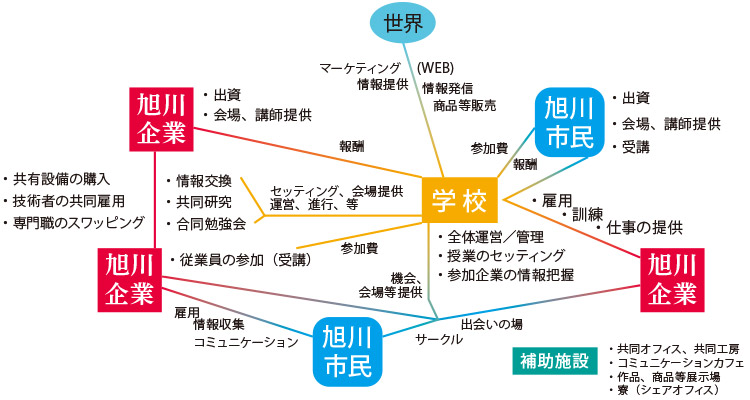 「学校を創ろう!」プロジェクトで創る(運営する)学校の理想は特定の企業や団体が運営する大学ではなく、企業内に設置する大学(教育施設)でもなく、旭川の複数の企業(団体・個人)が共同で運営する学校です。