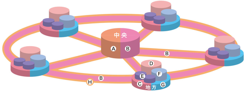 B.中央の中に地方を統括する専門の組織を作ります。その組織は中央(A)と連携しつつも地方の立場として(A)と時には対立します。