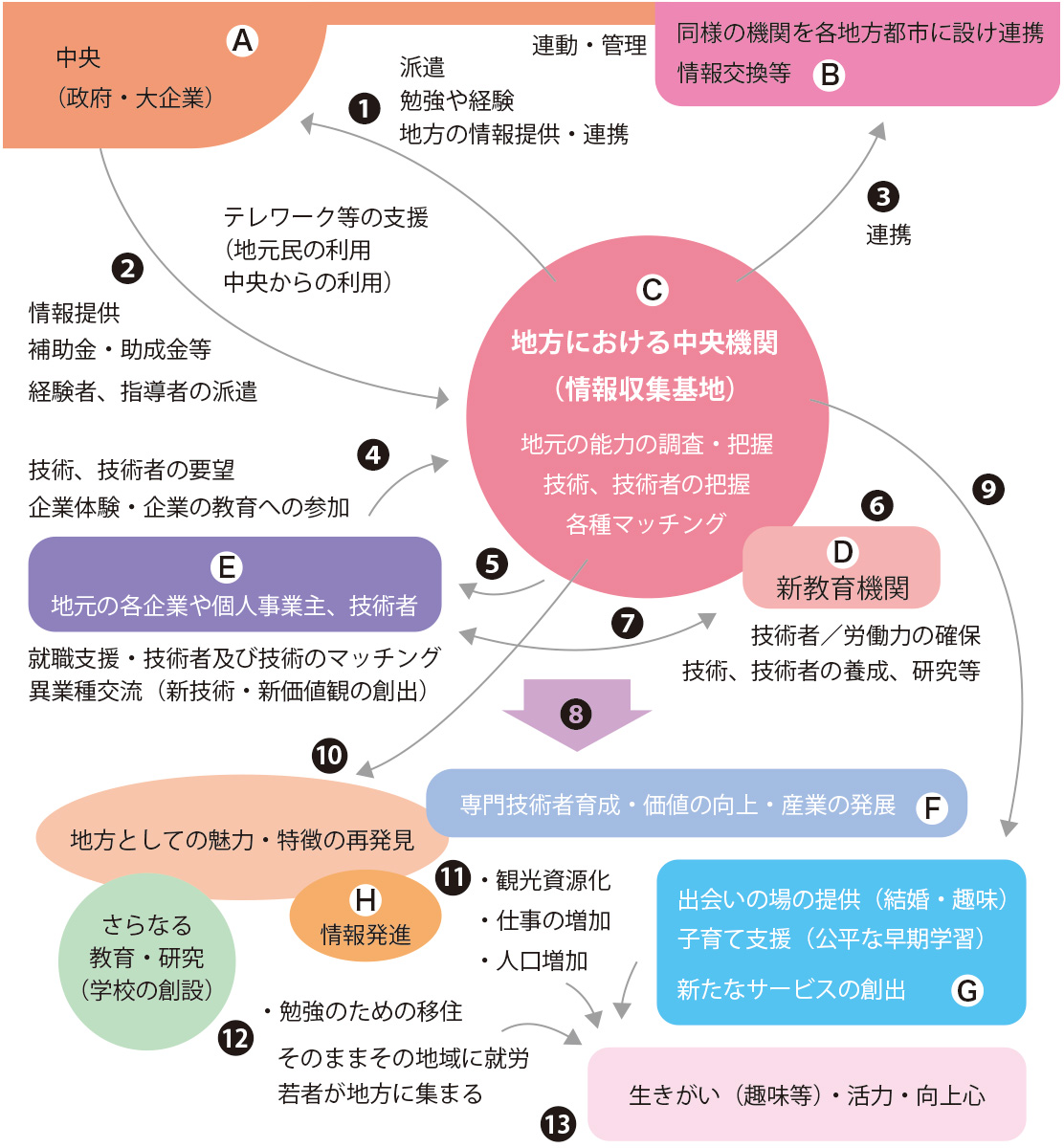 以上のことをざっとまとめますと、地方で散り散りになっている人を中央にまとめ、その人と人や情報や技術を繋げ、場合によっては研究し育てる施設を作ることによって、あらゆる面での地方の活性化を期待できます。